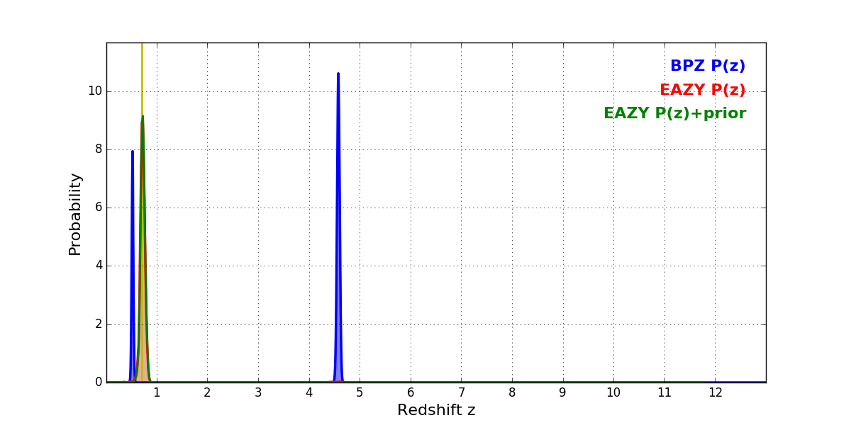 In P(z) plots: Yellow lines mark the cluster redshift z = 0.702,