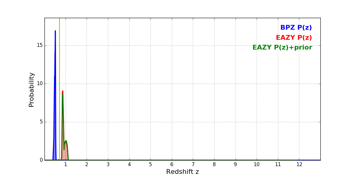 In P(z) plots: Yellow lines mark the cluster redshift z = 0.702,