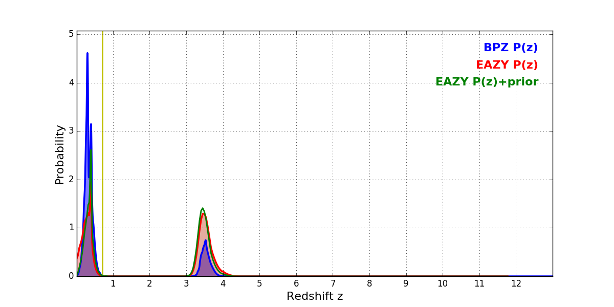 In P(z) plots: Yellow lines mark the cluster redshift z = 0.702,