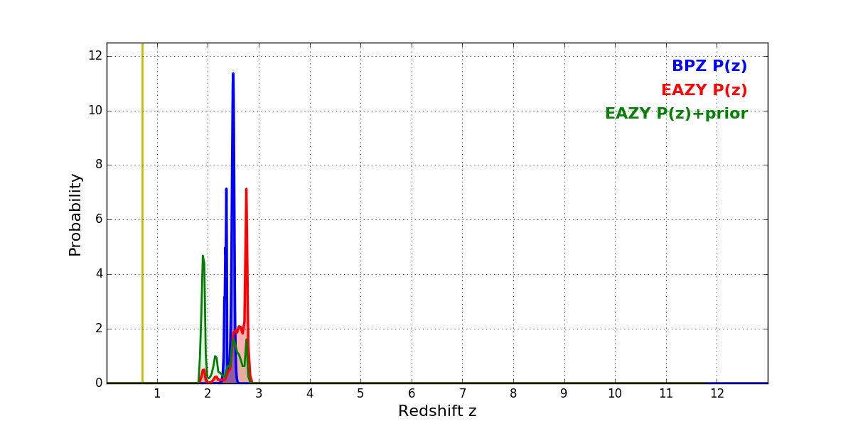 In P(z) plots: Yellow lines mark the cluster redshift z = 0.702,