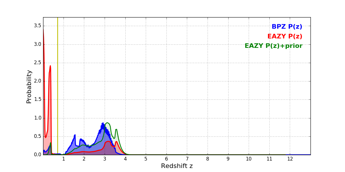 In P(z) plots: Yellow lines mark the cluster redshift z = 0.702,