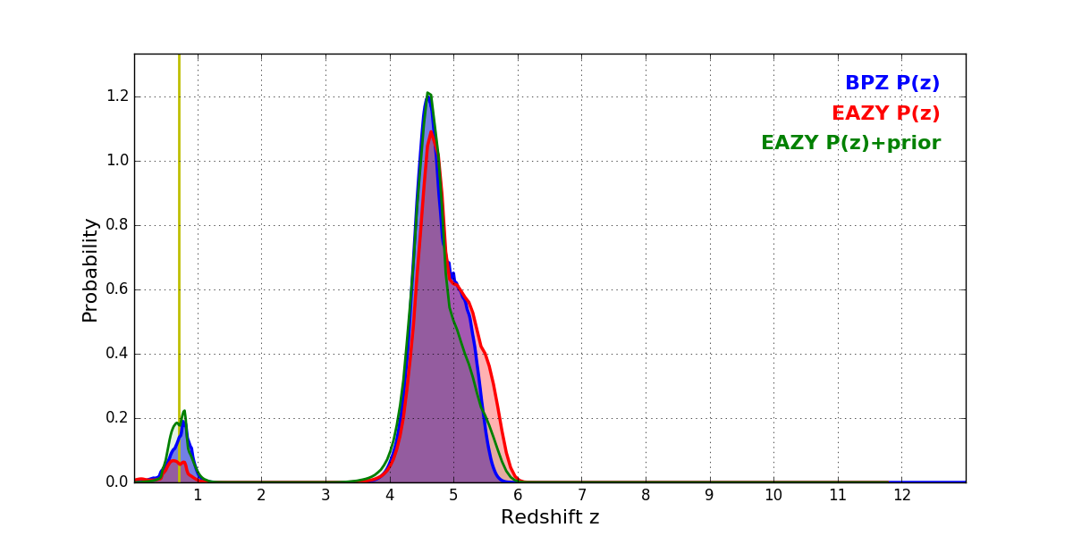 In P(z) plots: Yellow lines mark the cluster redshift z = 0.702,