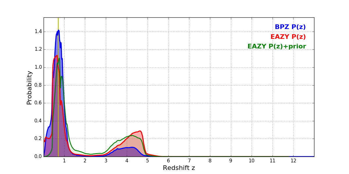 In P(z) plots: Yellow lines mark the cluster redshift z = 0.702,