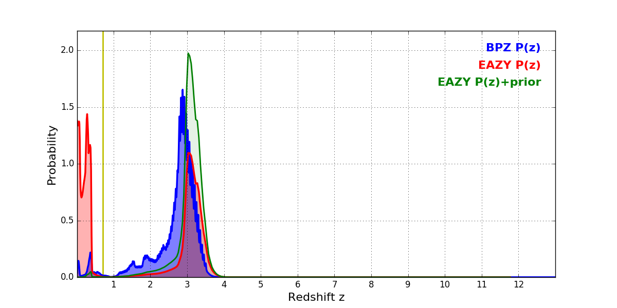 In P(z) plots: Yellow lines mark the cluster redshift z = 0.702,
