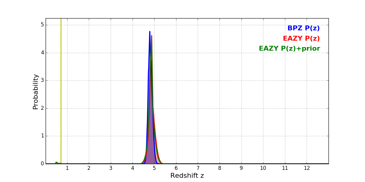 In P(z) plots: Yellow lines mark the cluster redshift z = 0.702,