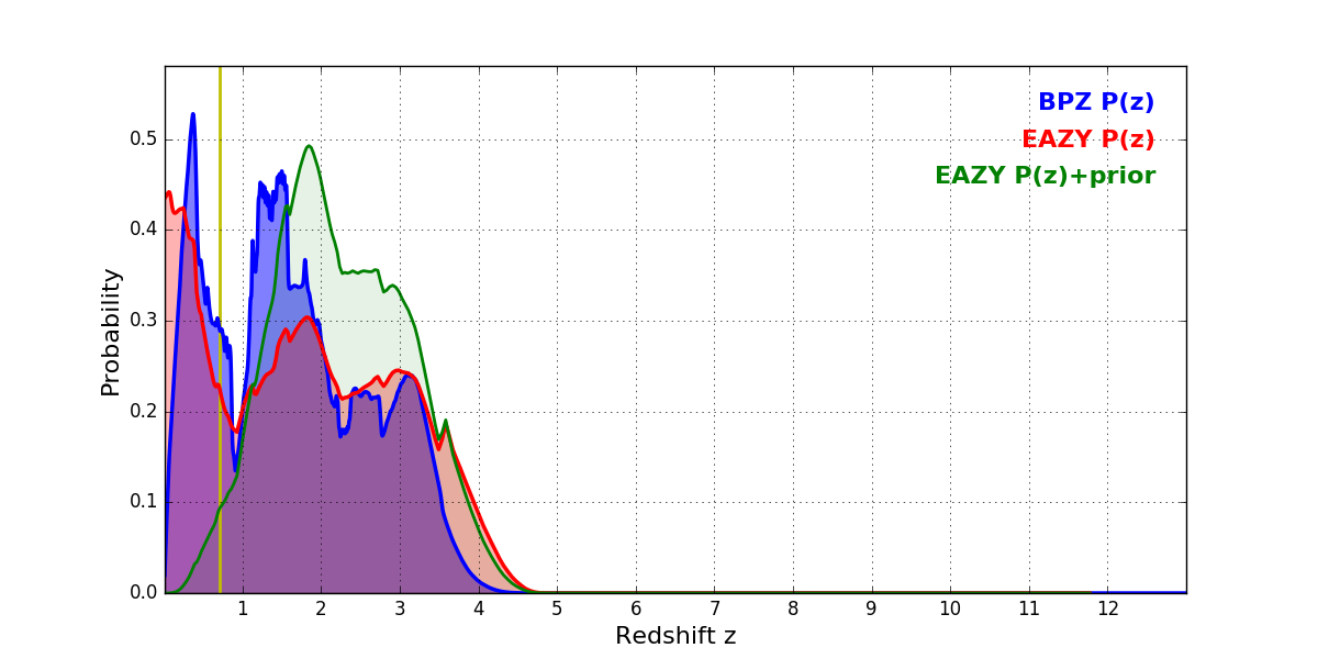 In P(z) plots: Yellow lines mark the cluster redshift z = 0.702,