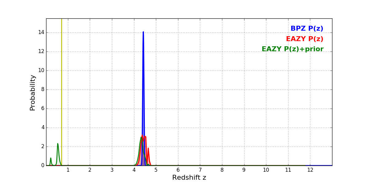 In P(z) plots: Yellow lines mark the cluster redshift z = 0.702,