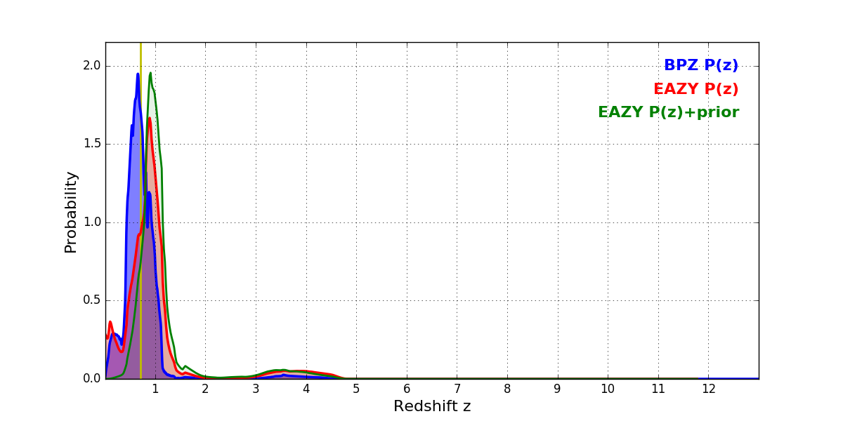 In P(z) plots: Yellow lines mark the cluster redshift z = 0.702,