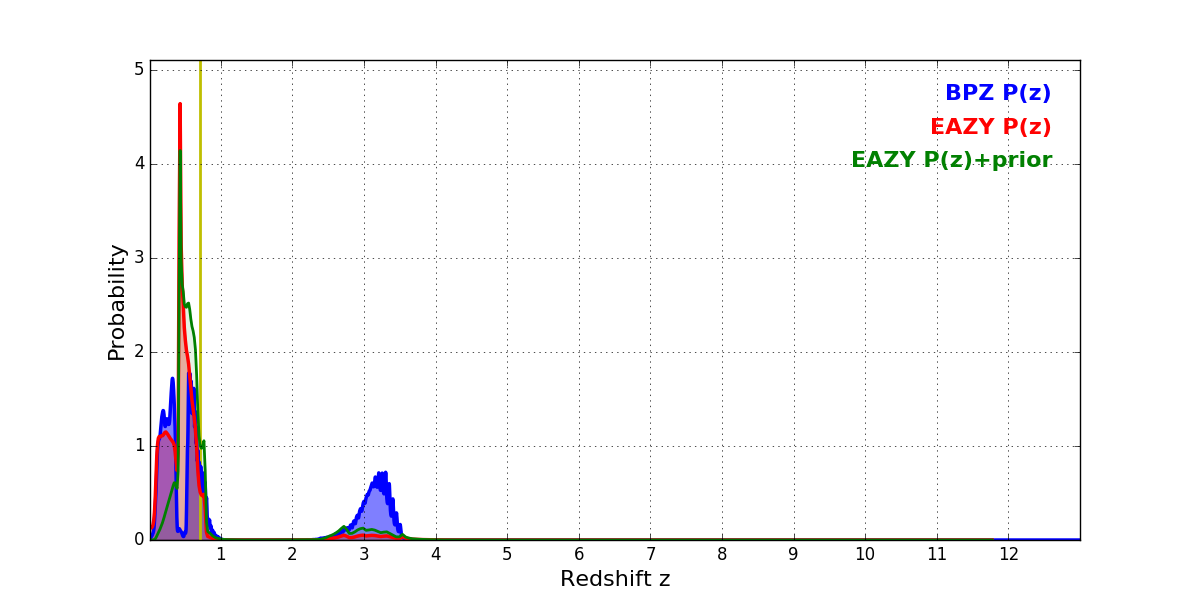 In P(z) plots: Yellow lines mark the cluster redshift z = 0.702,