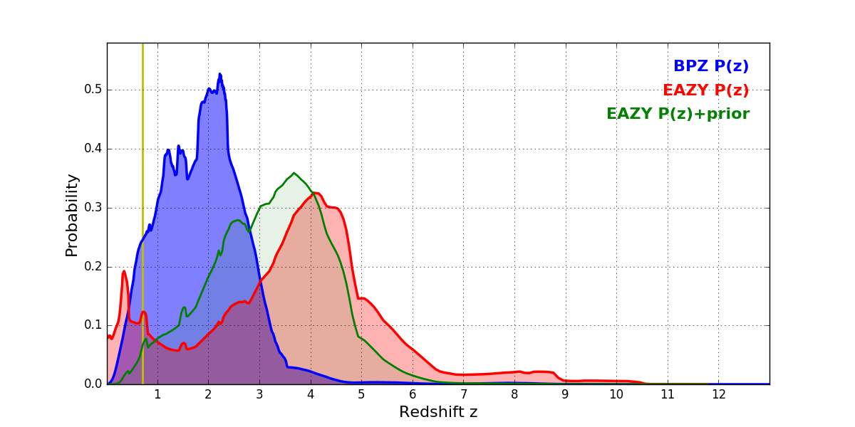 In P(z) plots: Yellow lines mark the cluster redshift z = 0.702,