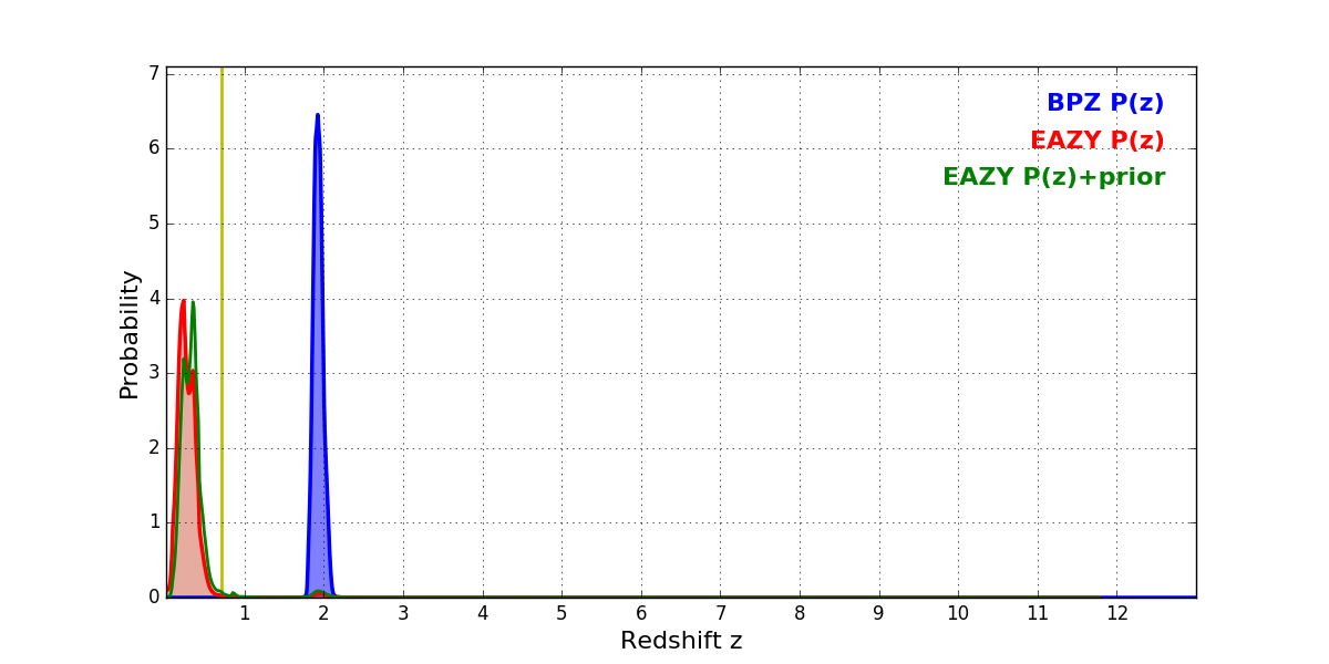 In P(z) plots: Yellow lines mark the cluster redshift z = 0.702,