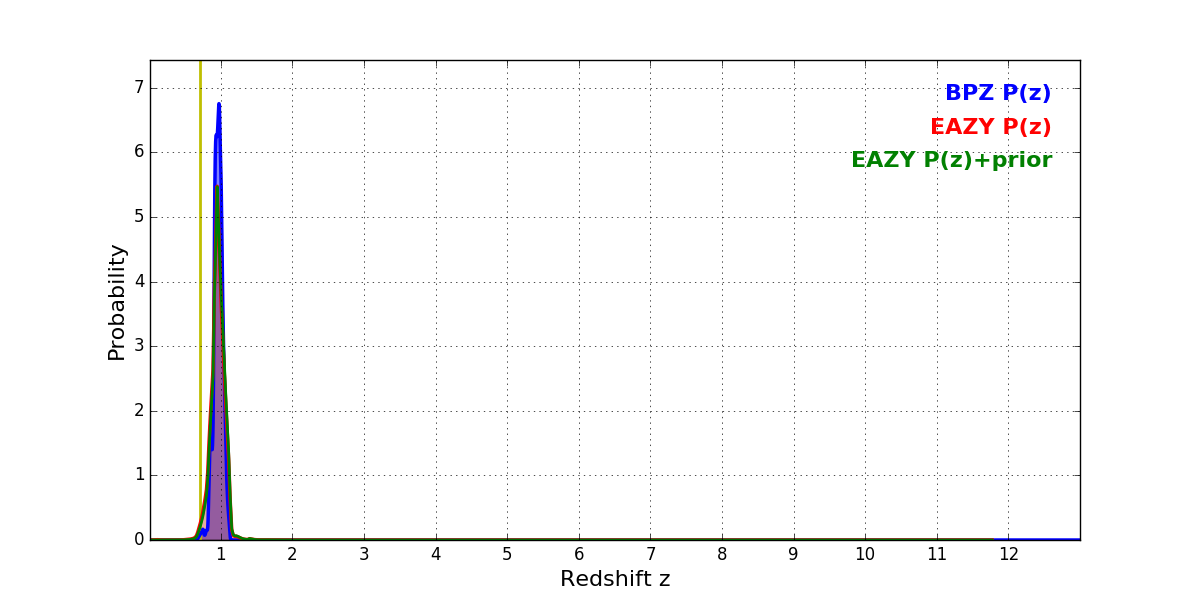 In P(z) plots: Yellow lines mark the cluster redshift z = 0.702,