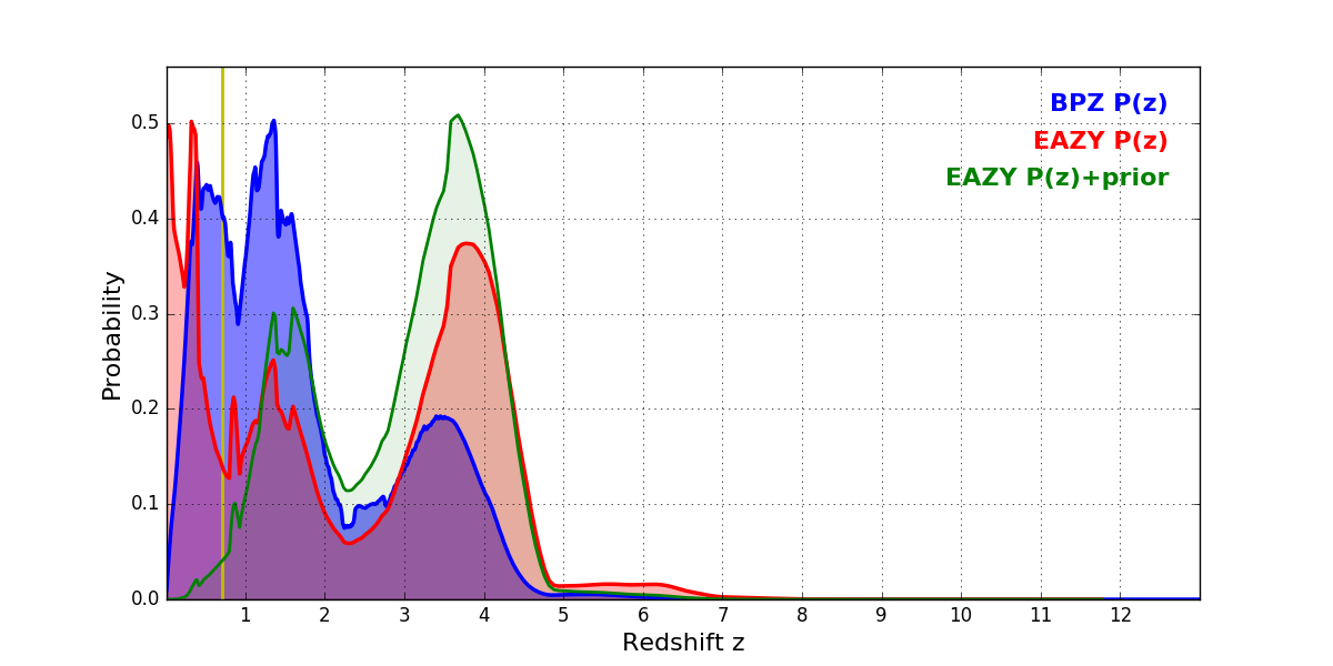 In P(z) plots: Yellow lines mark the cluster redshift z = 0.702,