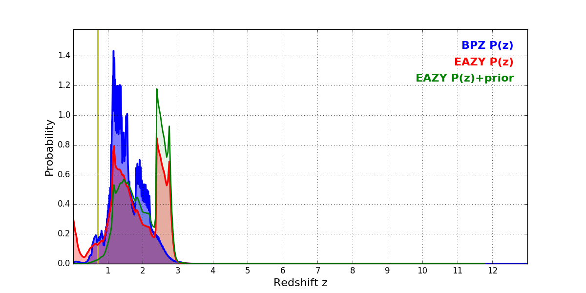 In P(z) plots: Yellow lines mark the cluster redshift z = 0.702,