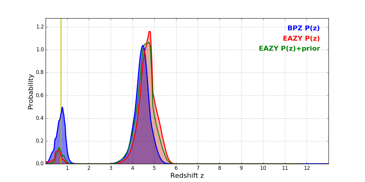 In P(z) plots: Yellow lines mark the cluster redshift z = 0.702,