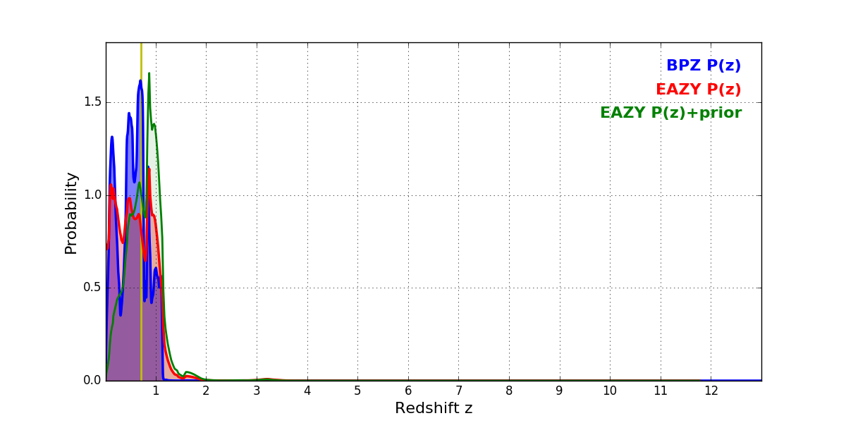In P(z) plots: Yellow lines mark the cluster redshift z = 0.702,