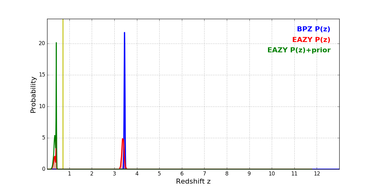 In P(z) plots: Yellow lines mark the cluster redshift z = 0.702,