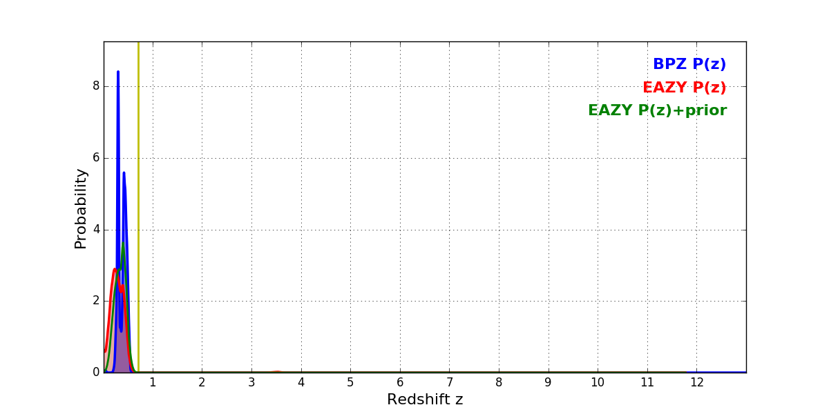 In P(z) plots: Yellow lines mark the cluster redshift z = 0.702,