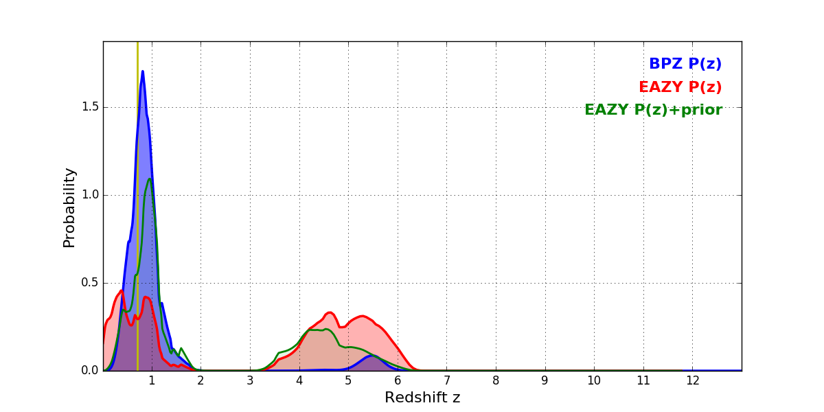 In P(z) plots: Yellow lines mark the cluster redshift z = 0.702,