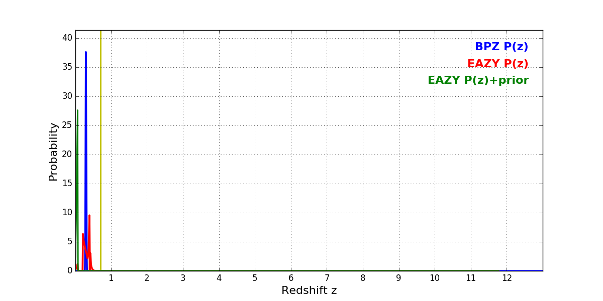 In P(z) plots: Yellow lines mark the cluster redshift z = 0.702,