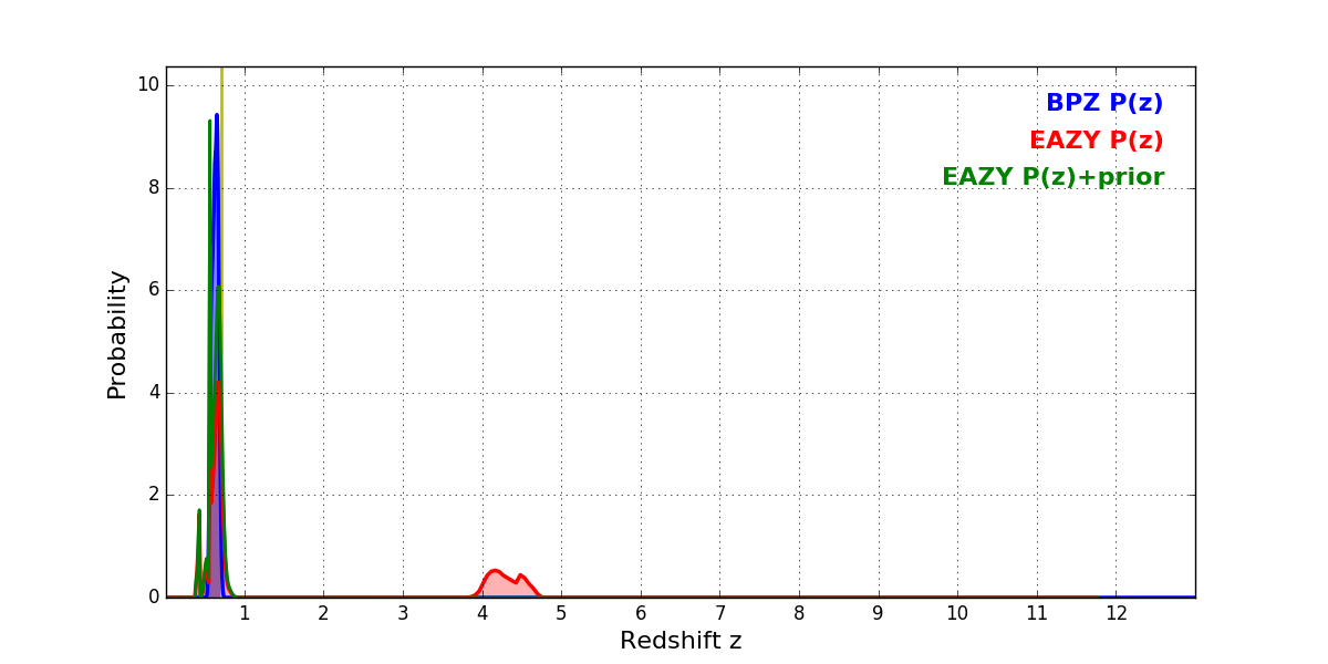 In P(z) plots: Yellow lines mark the cluster redshift z = 0.702,