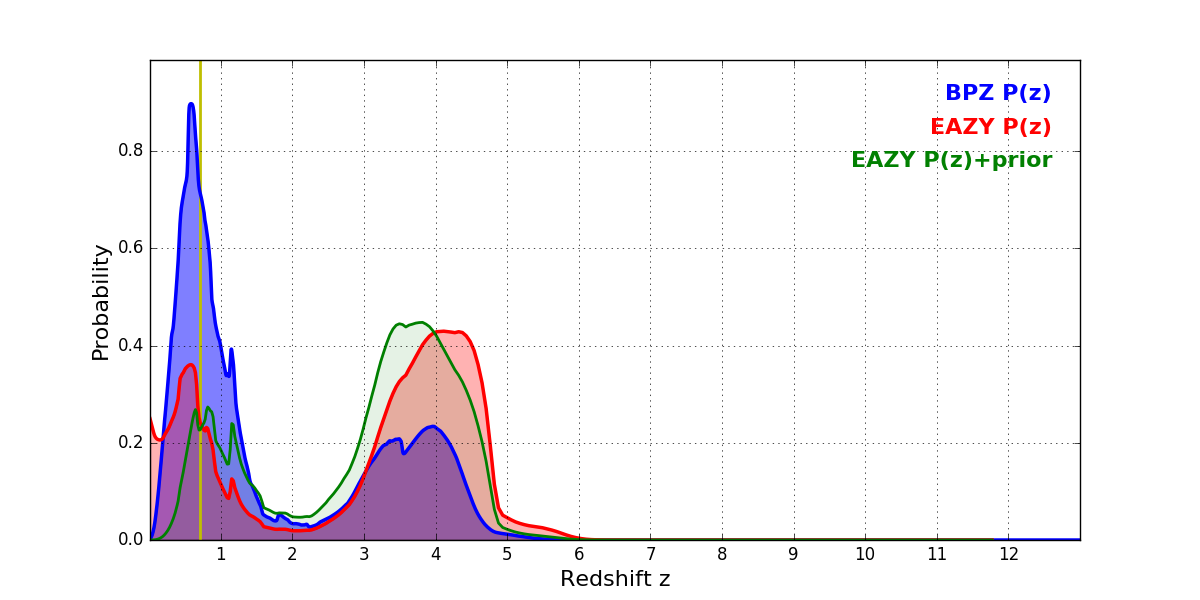 In P(z) plots: Yellow lines mark the cluster redshift z = 0.702,