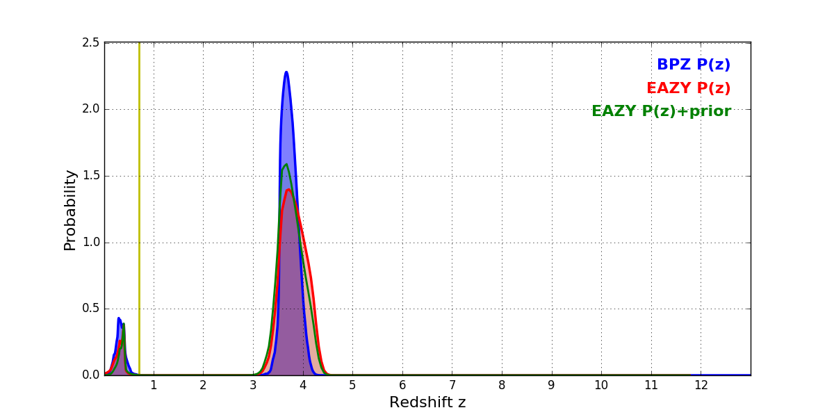 In P(z) plots: Yellow lines mark the cluster redshift z = 0.702,