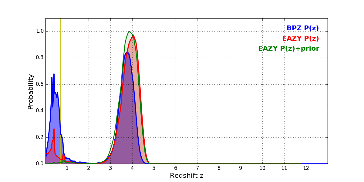In P(z) plots: Yellow lines mark the cluster redshift z = 0.702,