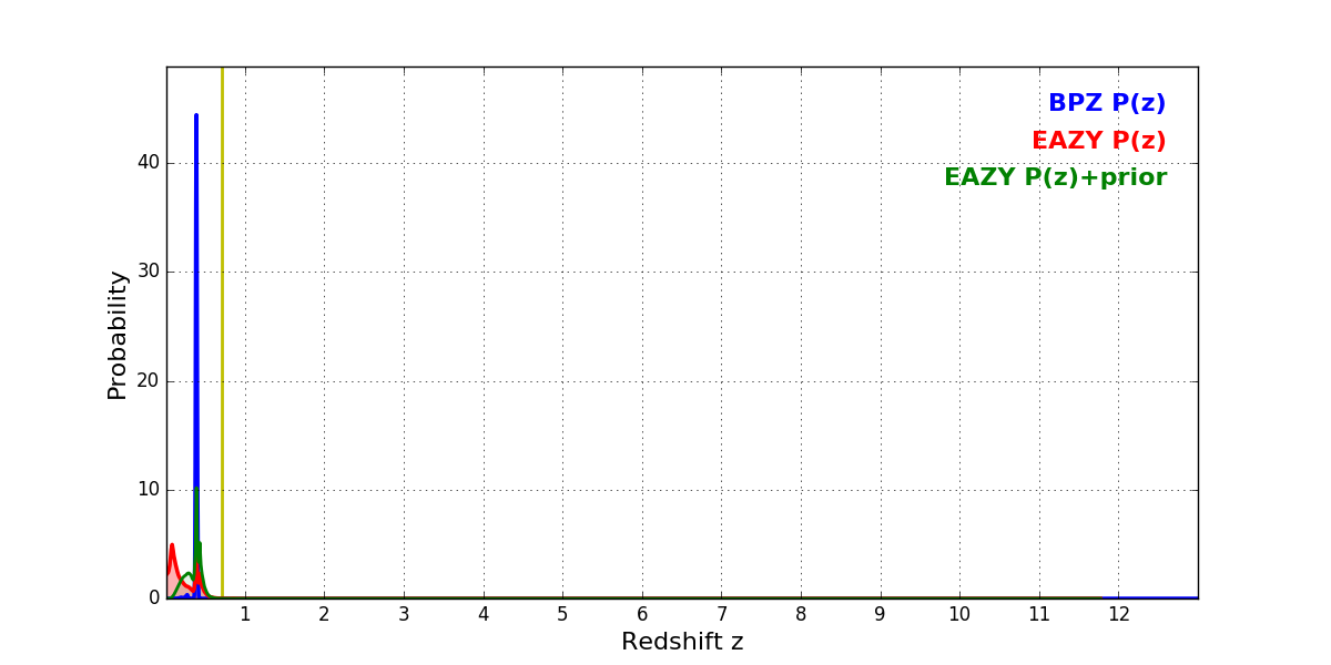 In P(z) plots: Yellow lines mark the cluster redshift z = 0.702,