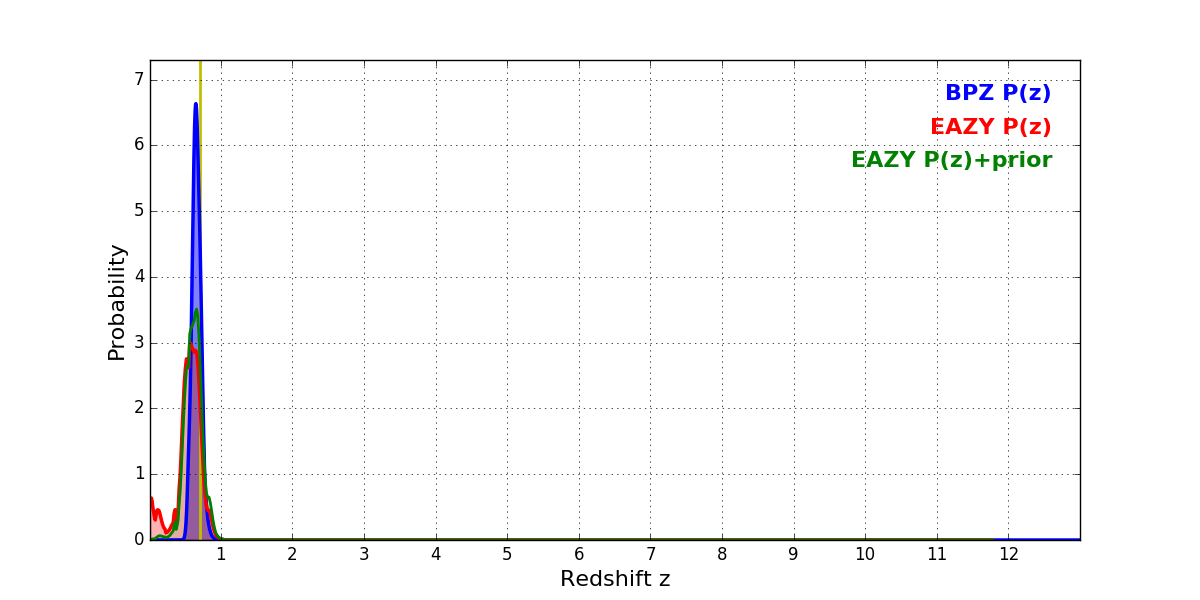 In P(z) plots: Yellow lines mark the cluster redshift z = 0.702,