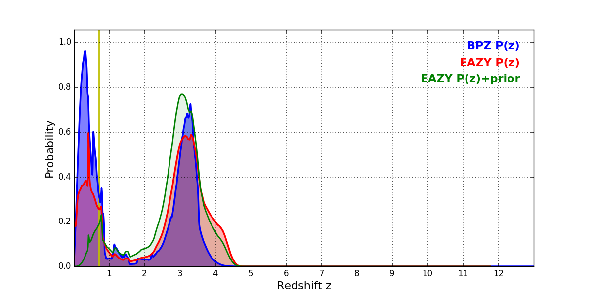 In P(z) plots: Yellow lines mark the cluster redshift z = 0.702,