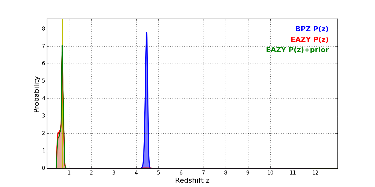 In P(z) plots: Yellow lines mark the cluster redshift z = 0.702,
