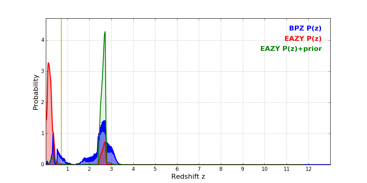 In P(z) plots: Yellow lines mark the cluster redshift z = 0.702,