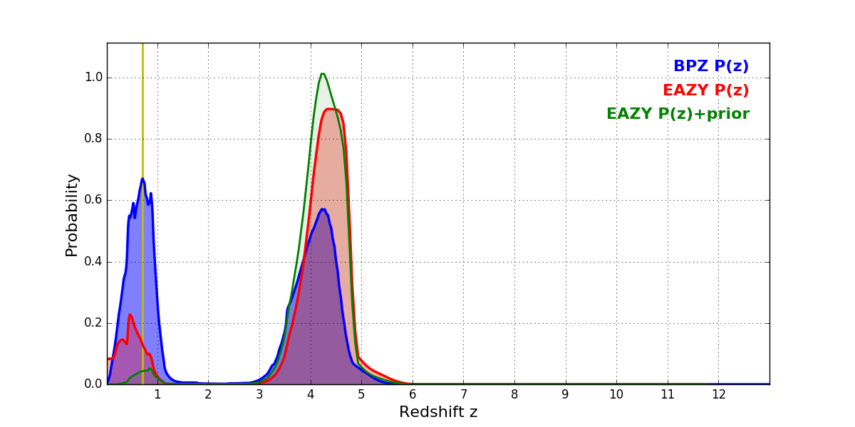 In P(z) plots: Yellow lines mark the cluster redshift z = 0.702,