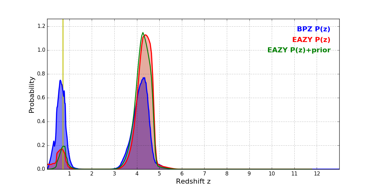 In P(z) plots: Yellow lines mark the cluster redshift z = 0.702,