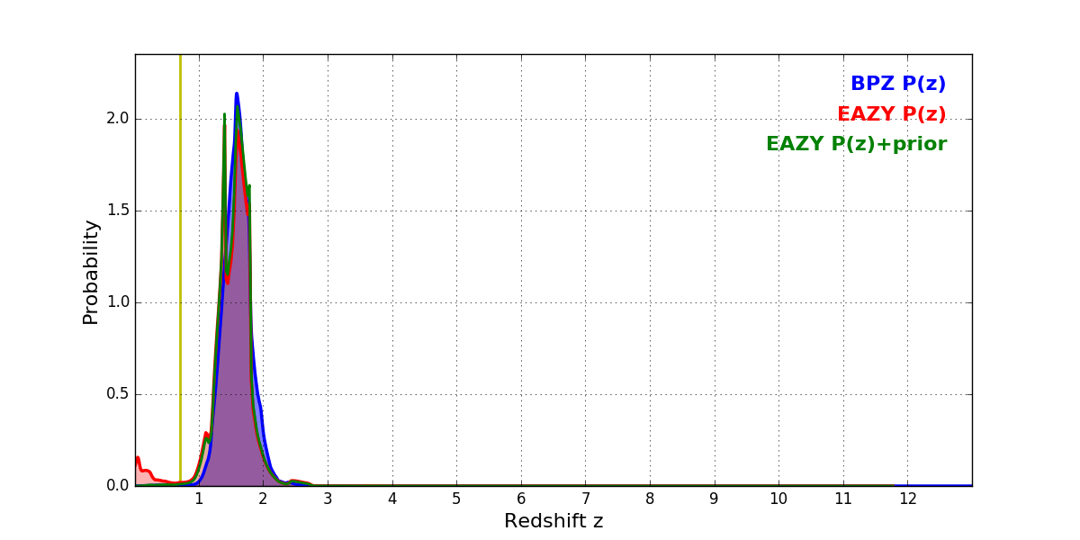 In P(z) plots: Yellow lines mark the cluster redshift z = 0.702,