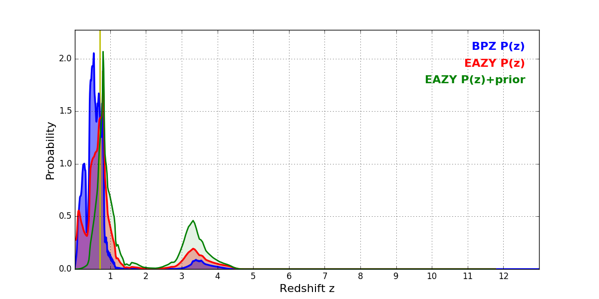 In P(z) plots: Yellow lines mark the cluster redshift z = 0.702,
