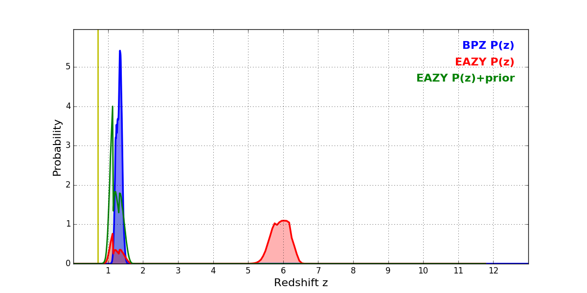 In P(z) plots: Yellow lines mark the cluster redshift z = 0.702,