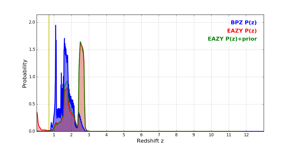 In P(z) plots: Yellow lines mark the cluster redshift z = 0.702,