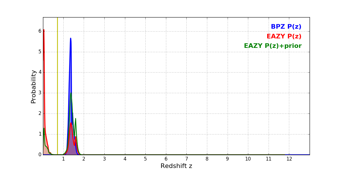 In P(z) plots: Yellow lines mark the cluster redshift z = 0.702,