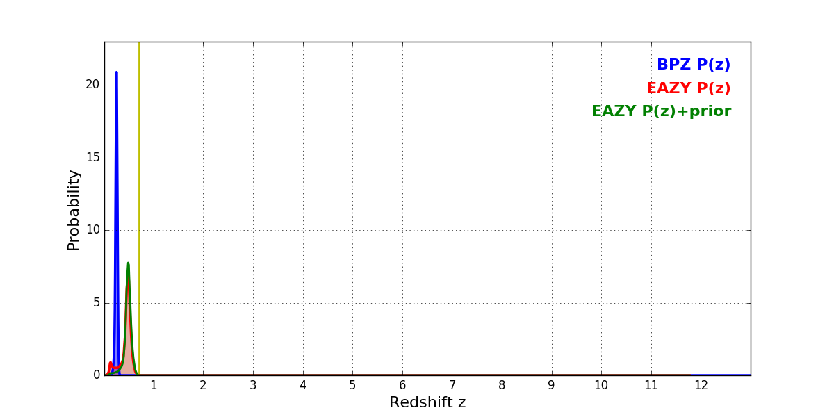 In P(z) plots: Yellow lines mark the cluster redshift z = 0.702,