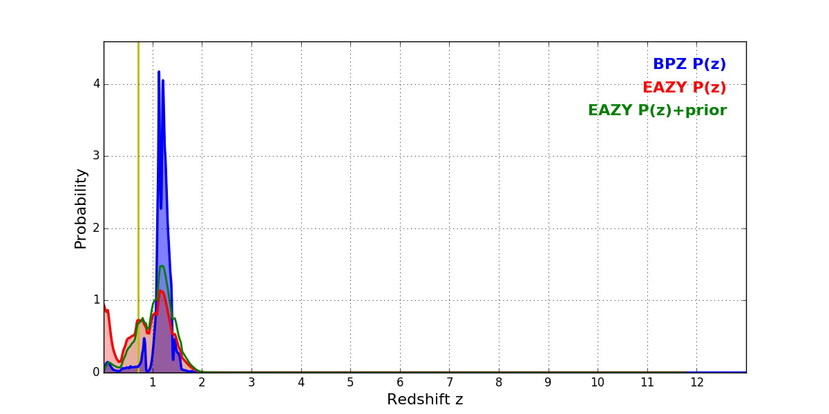 In P(z) plots: Yellow lines mark the cluster redshift z = 0.702,
