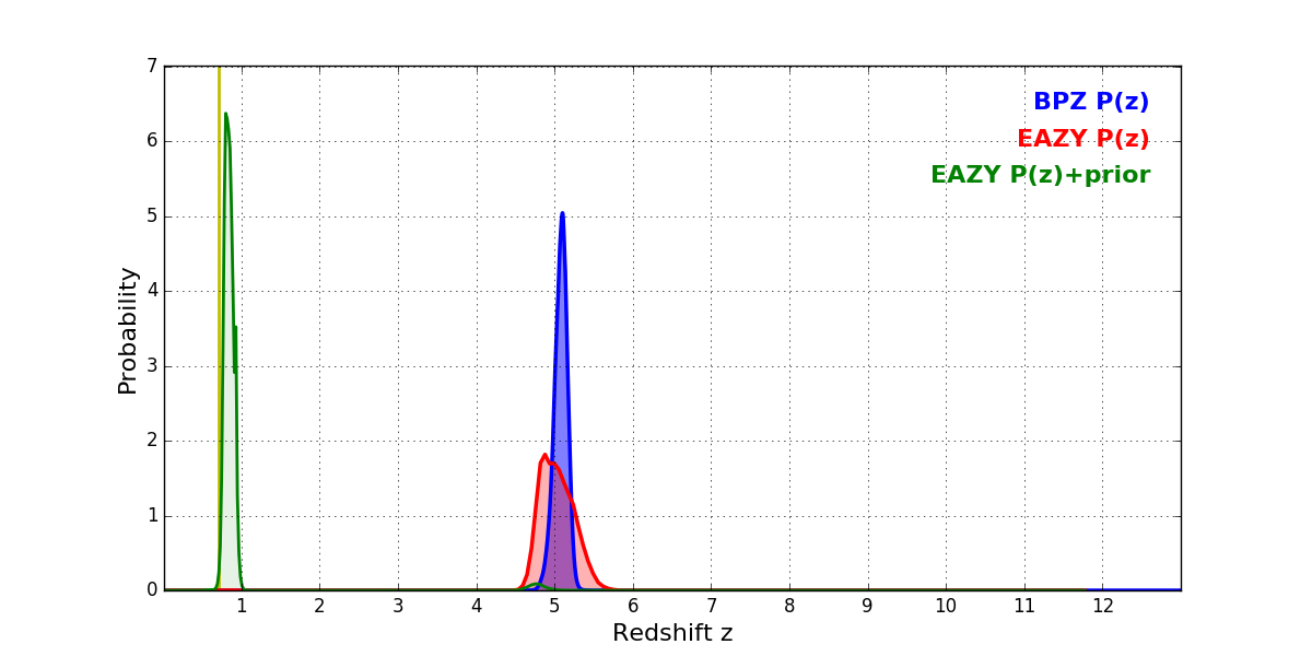 In P(z) plots: Yellow lines mark the cluster redshift z = 0.702,