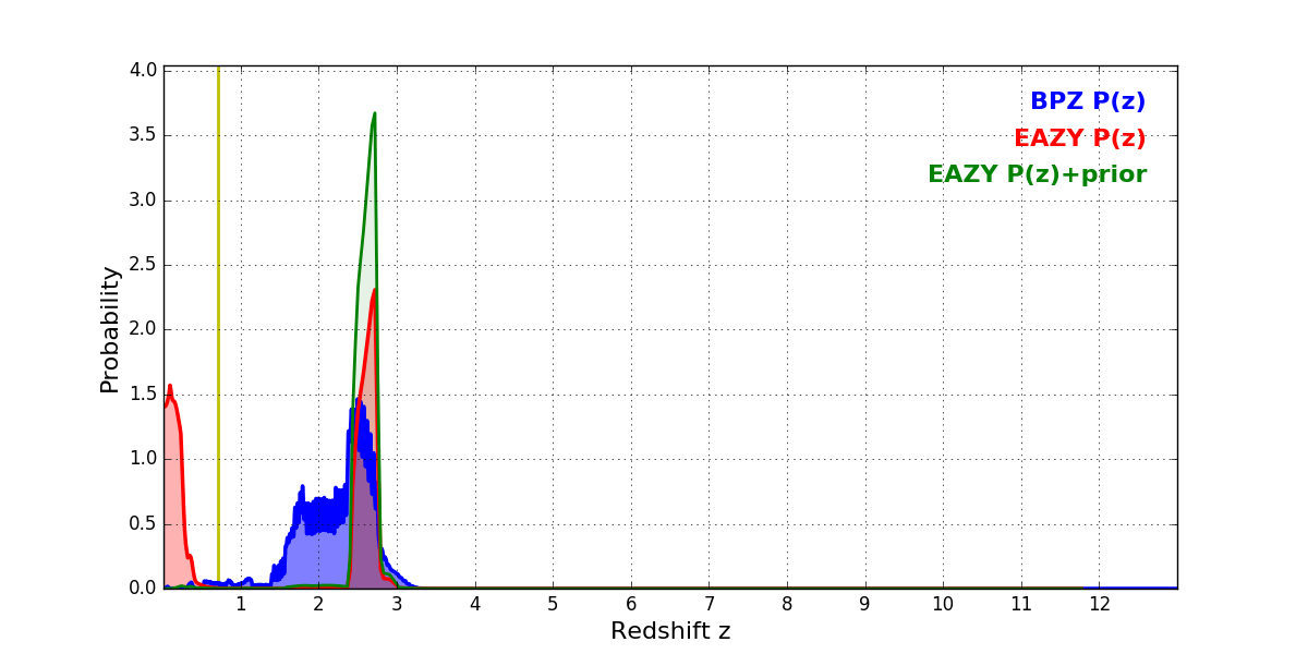 In P(z) plots: Yellow lines mark the cluster redshift z = 0.702,