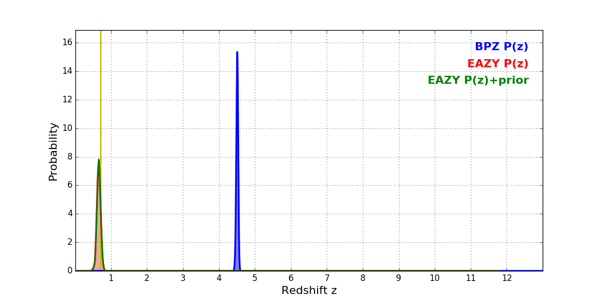 In P(z) plots: Yellow lines mark the cluster redshift z = 0.702,