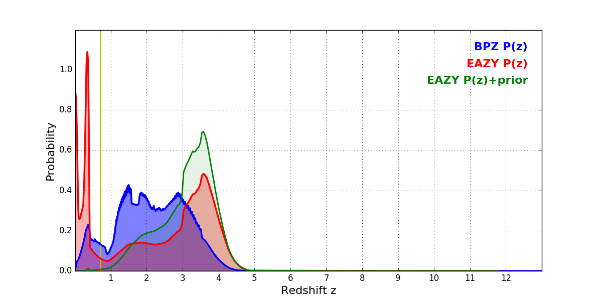 In P(z) plots: Yellow lines mark the cluster redshift z = 0.702,