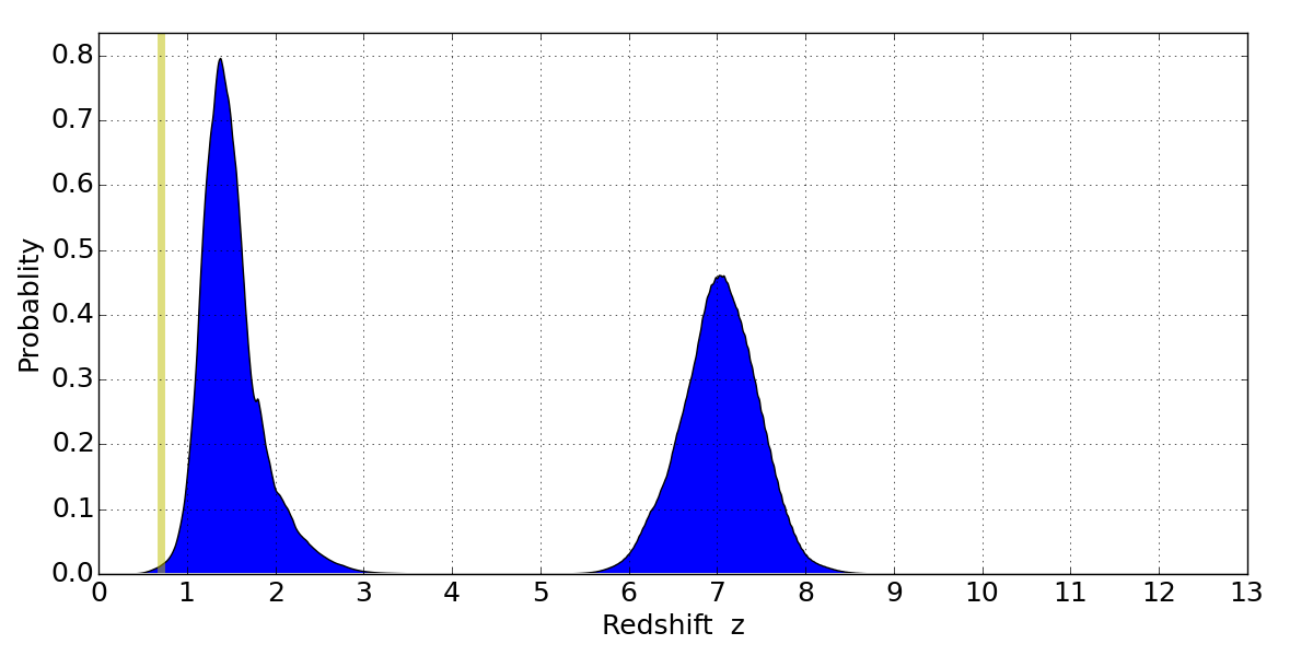 In P(z) plots: Yellow lines mark the cluster redshift z = 0.702,