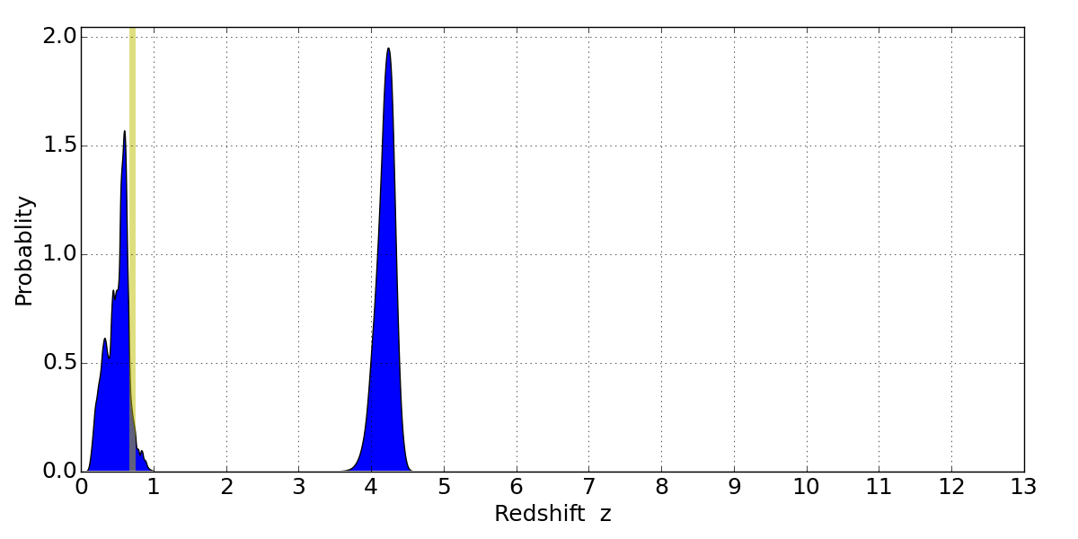 In P(z) plots: Yellow lines mark the cluster redshift z = 0.702,
