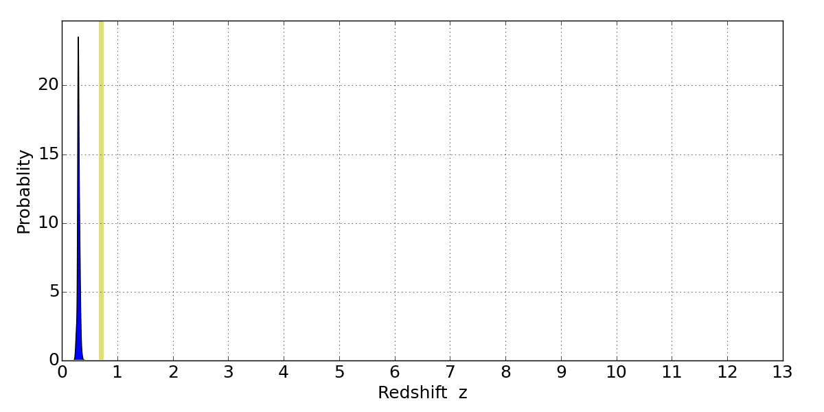 In P(z) plots: Yellow lines mark the cluster redshift z = 0.702,