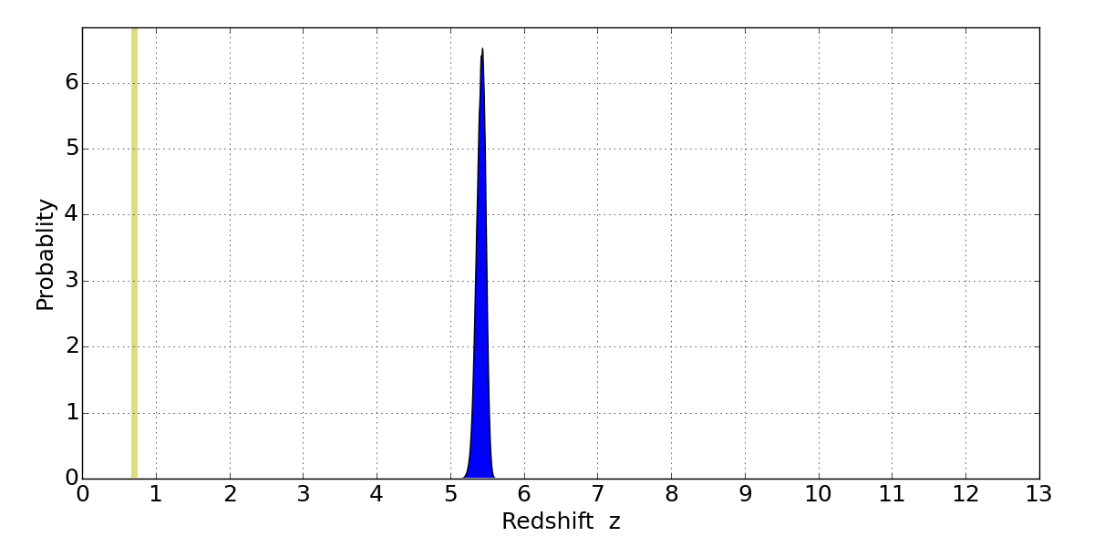 Object #238   x,y = (2054, 3183)   RA, Dec = (02:27:08.928, 49:01:10.56) = (36.78720, 49.01960)   BPZ = 5.440 [5.290--5.527]   type = 7.80 (SB1_B10 - Scd_B10)   chisq2 = 0.15   ODDS = 1.00   z_cluster = 0.702
